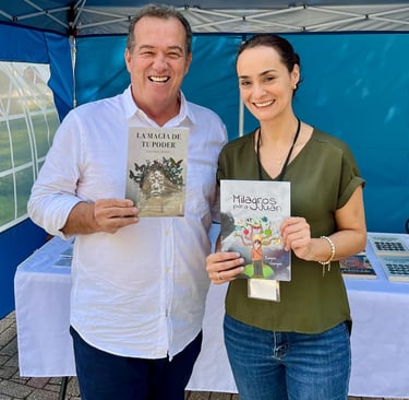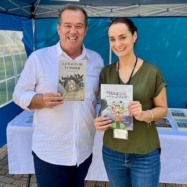 En el stand en el que tuve la oportunidad de participar con "La magia de tu poder", dos figuras colombianas irradiaron una energía única. Eduardo Marceles Daconte y Edgar Vargas, con sus miradas cargadas de experiencias y sus sonrisas llenas de complicidad, no solo ofrecían sus libros al público, sino que también compartían sus vivencias y reflexiones con aquellos que se acercaban. Eduardo, con su voz pausada pero llena de pasión, narraba anécdotas sobre sus experiencias y representaciones culturales colombianas. Sus libros transportaban a los lectores a otros lugares llenos de música y color.